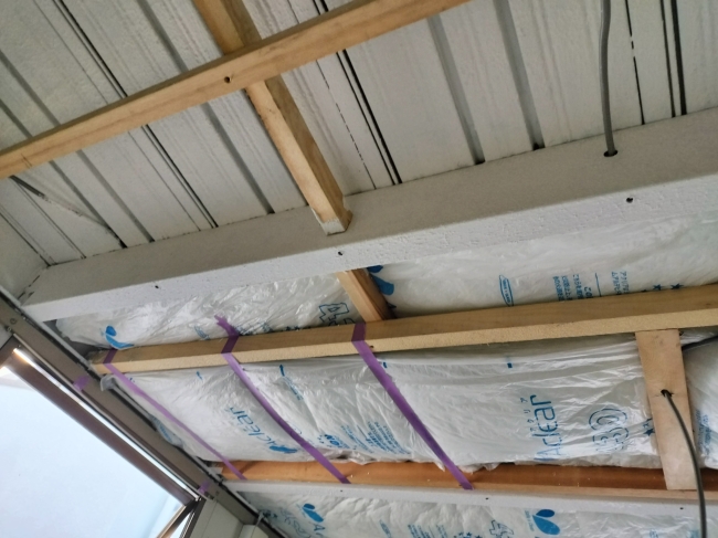 4.天井部の隙間へ断熱材(グラスウール)を隙間が発生しないよう敷き詰めます。
