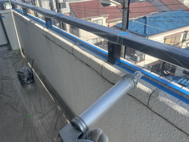 【ひび割れ補修工事】2㎜以上のひび割れ箇所はベビーサンダーでVカットして変成シリコンを充填している施工状況。