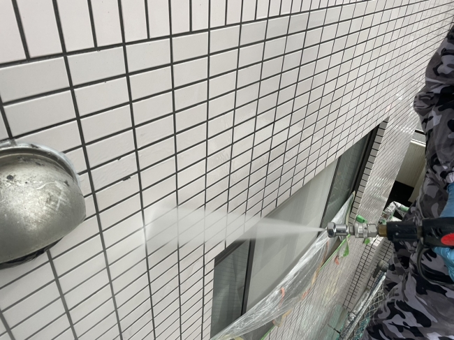 【薬品洗浄工事】外壁タイルを薬品にて付着した汚れやコケなどを磨いて落とし高圧水洗浄機で洗浄している施工状況。