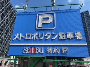 東京都内の駐車場にて、看板塗替え工事を施工いたしました。 【足場設置(施工前)】 【看板裏側施工工事(施工状況)】 【看板塗装完了(施工