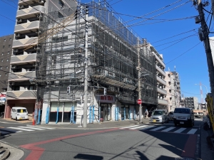 東京都江東区の砂町付近にて、マンションの大規模修繕工事を行っております。 【施工前(足場設置完了)】